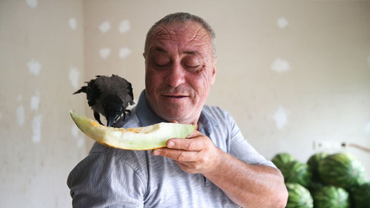 Hatay'da yaşayan ve manavcılık yapan Tekin Talşık (52), bitkin halde bulduğu karga yavrusuna 5 aydır bakıyor. Talşık karaganın bütün ihtiyaçlarını karşılıyor.