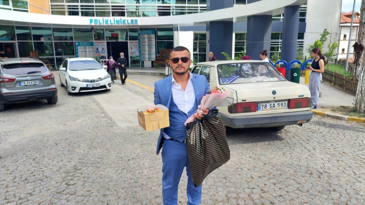 Karabük'te hasta ve sağlık çalışanlarına darp gerekçesiyle açığa alınan uzman çavuş Serkan Balcı, pasta ve çiçekle özür diledi.